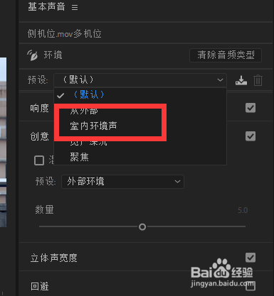 5、最后我们选中音频然后点击右边的环境就会弹出页面我们点击里面的预设选择室内即可